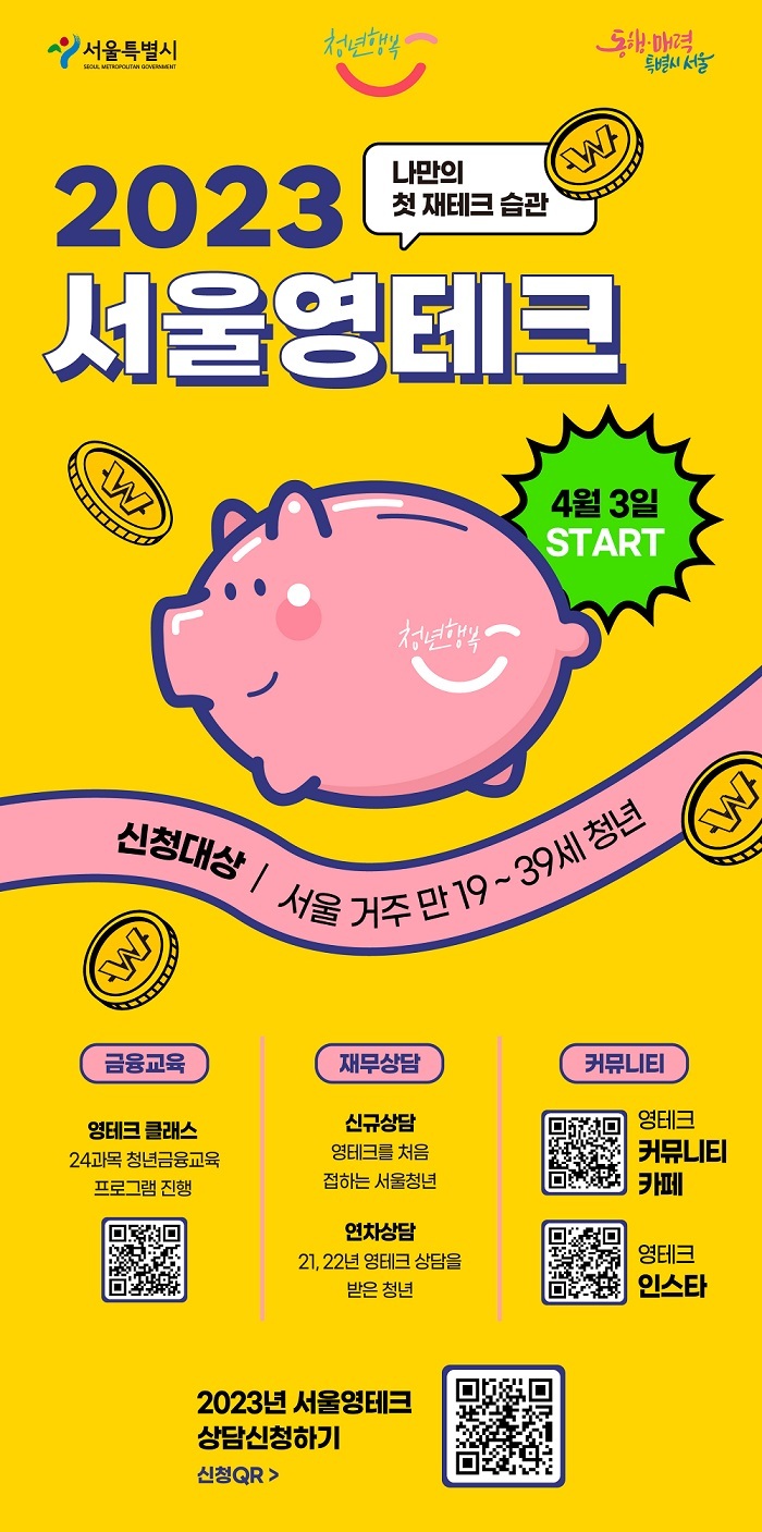 서울영테크는 서울시의 청년 특화사업으로 자산 형성이 어려운 청년에게 효과적이고 체계적인 맞춤형 재무상담과 금융교육을 제공하여 경제적 자립을 지원하는 사업입니다. 2023년 사업 시행 3년차를 맞이하여 4개 분야에 대해 더욱 강화된 지원으로 한단계 도약하였습니다.