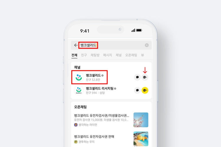 Tip) 카카오톡 친구 목록에서 우상단의 돋보기를 클릭하고 ‘뱅크샐러드’를 검색해서 찾을 수도 있어요.