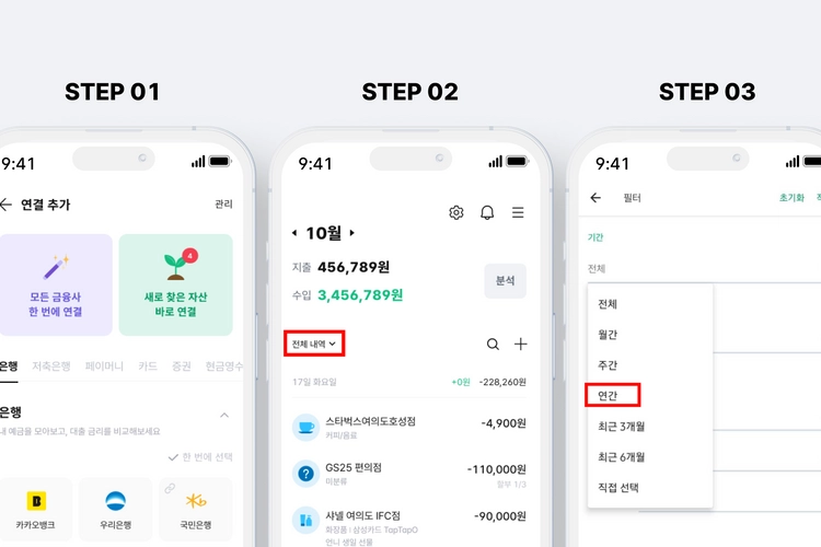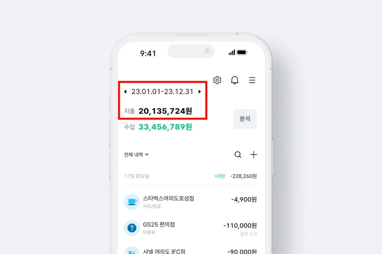 2. 지출 내역을 확인하기 위해 1분 만에 내 금융사를 연동 후 가계부에서 연간 필터를 적용합니다.