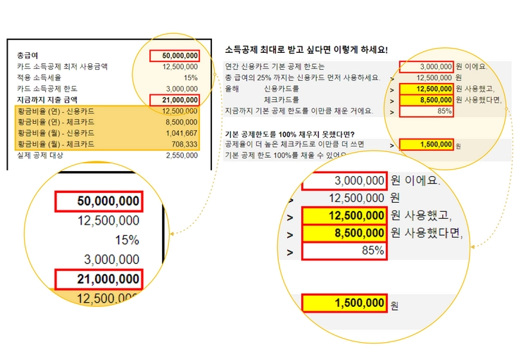 연말정산 소득공제 최대로 받을 수 있는 신용카드와 체크카드 금액을 확인할 수 있어요. 만약 각 지출 수단별 금액을 맞추지 못했다면, 남은 연말동안 최대한 맞추어서 사용해보세요! 조금이라도 소득공제를 많이 받을 수 있을 거에요.