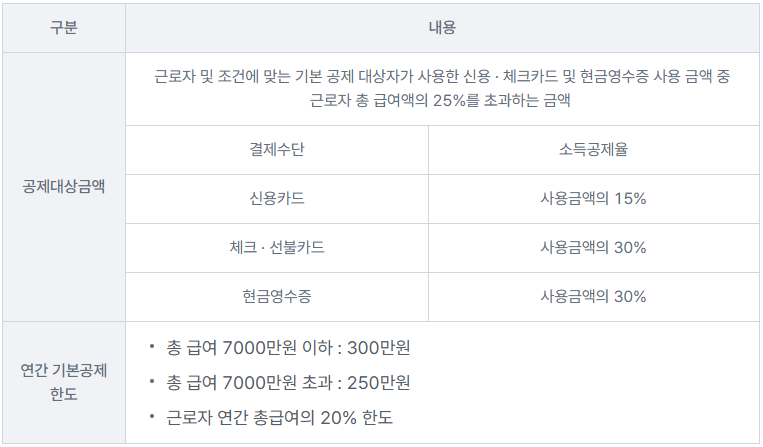 [ 체크카드 지출 1,000만 원 ] * 30% (체크카드의 소득 공제율) = 300만원 (공제 한도)