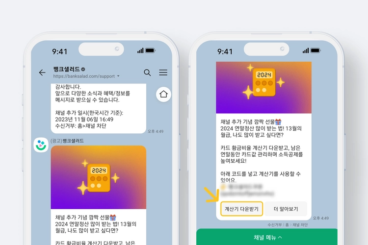 웰컴 메시지를 통해 연말정산 계산기 다운로드 링크와 비밀번호를 보내드려요. 정책 상의 이유로 20시 55분 이후에 친구 추가할 경우, 익일 오전 8시에 웰컴 메시지가 발송되는 점을 참고해주세요.