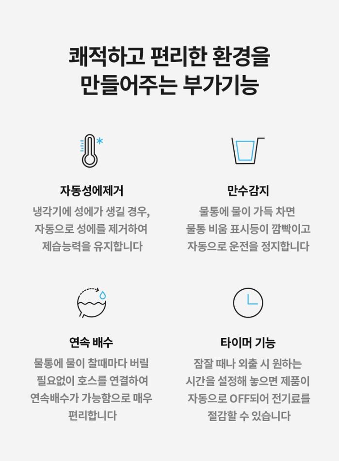 이 제품은 자동제습 모드 기능을 탑재하여 사용자의 편의성을 높였습니다. 제습기의 작동 상태를 실시간으로 모니터링하고 조절할 수 있습니다. 또한, 스마트 타이머 기능을 활용하여 원하는 시간에 자동으로 작동하도록 설정할 수 있어 편리하게 사용할 수 있습니다.
