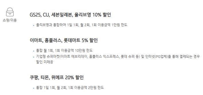 - 통합 월 1회, 1회 이용 금액 10만원 한도에서 제공됩니다. 단, 기업형 슈퍼마켓은 제외됩니다.